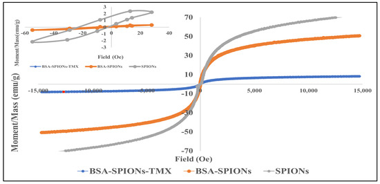 Figure 3 shows the room temperature magnetic hysteresis loop of SPIONs, BSA-SPIONs, and BSA-SPIONs-TMX, which demonstrates the superparamagnetic behavior of green synthesized magnetic nanoparticles (SPIONs). The hysteresis loop was zoomed in around zero field to study the magnetic properties (inset Figure 3). The saturation magnetization (Ms) of SPIONs was found to be 72.05 emu/g, whereas the Ms of BSA-SPIONs was found to be 50.70 emu/g, which was decreased as compared to SPIONs due to coating with BSA. The Ms observed for BSA-SPIONs-TMX was 8.31 emu/g. The reduction in Ms after coating could be due to some dead layer generated after coating in the magnetic nanoparticles [59,60]. Moreover, the Ms value reported in the literature for coated magnetic nanoparticles was in the range of 2.5 to 57 emu/g [61]. At room temperature, these BSA-SPIONs-TMX are superparamagnetic, making them beneficial for targeted drug delivery, and there are negligible chances of the agglomeration of particles because of the magnetic dipole attraction. These nanoparticles almost do not possess residual magnetization unless an external magnetic field is applied to them.