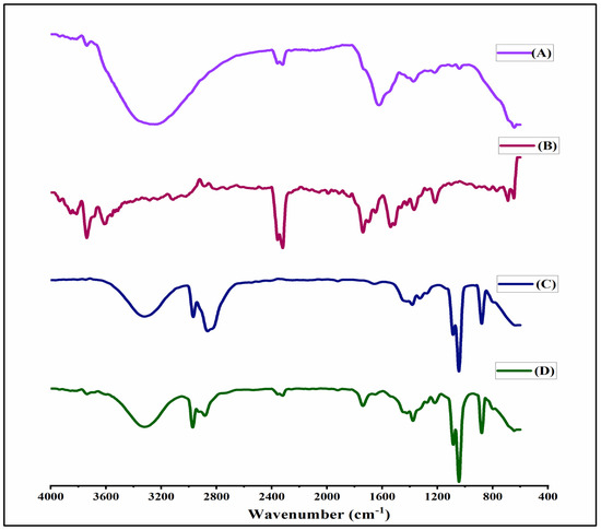 FTIR spectra of (A) SPIONs (10 mg), (B) TMX (10 mg), (C) BSA (10 mg), and (D) BSA-SPIONs-TMX (10 mg).