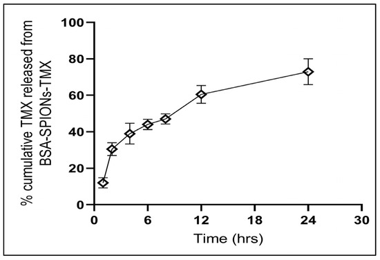 The in vitro release kinetic pattern of TMX from BSA-SPIONs-TMX was assessed in phosphate buffer solution (pH 7.4) using the dialysis method, in which ~8–10% of TMX was released from BSA-SPIONs-TMX within the first 2 h (Figure 7). After 24 h, ~74–76% of the TMX was released from the BSA-SPIONs-TMX, suggesting a sustained drug delivery pattern of BSA-SPIONs. Such a sustained drug delivery system is particularly important for targeted nano-drug delivery where the drug has to reach a target site.