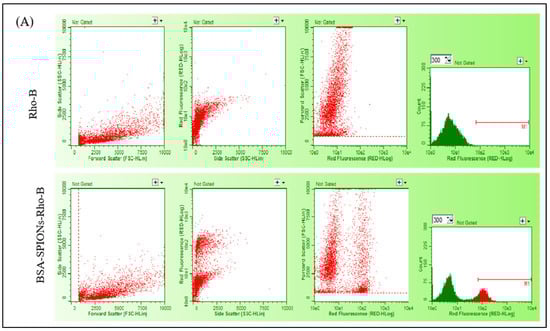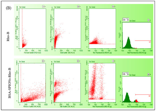 MCF-7 and T47D cells were incubated with Rhodamine-B-loaded BSA-SPIONs, and the intracellular uptake of BSA-SPIONs was determined using flow cytometry after 4 h of incubation. BSA-SPIONs must be able to be internalized into various types of cells in the maximum amount and as quickly as possible to be an ideal drug delivery system. SPIONs were reported to internalize into cells via endocytosis more efficiently in cancer cells compared to normal cells, as evidenced by the qualitative, semi-quantitative, and quantitative analysis [65,66]. In our study, the internalization of BSA-SPIONs was evident from the side scatter plot of the fluorescence intensity in MCF-7 and T47D cells, as shown in Figure 8, which was higher compared to plain Rho-B. The ROD-B dye has an emission and excitation spectrum. Interaction between a laser beam and the fluorescing cells or particles causes a pulse of photons to occur over time (peak). They are detected by PMTs as a voltage pulse in the form of an event. The intensity of the fluorescence is directly related to the voltage pulse area. The M1 events provide an indication of number of particles internalized in the cells and is correlated by higher fluorescence intensity. The number of cells stain due to dye causes the curve plot to shift to right, which is determined by an increase in number of M1 events, which is directly proportional to the cellular uptake. The number of events attributed increases with fluorescence.