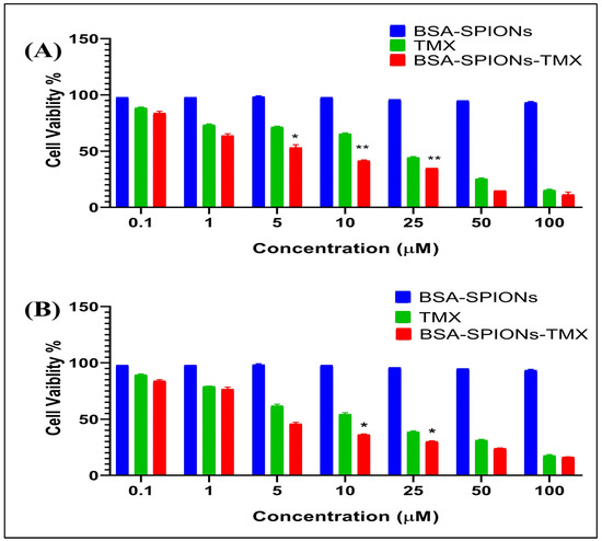 Percentage cell viability profile of TMX and BSA-SPIONs-TMX against (A) MCF-7 cell lines and (B) T47D cell lines (mean ± SD, n = 3); Note: (* indicates p < 0.05 compared with TMX and ** indicates p < 0.01) compared with BSA-SPIONs-TMX.