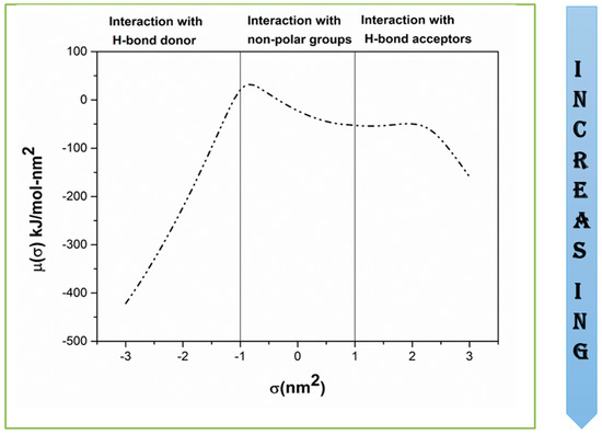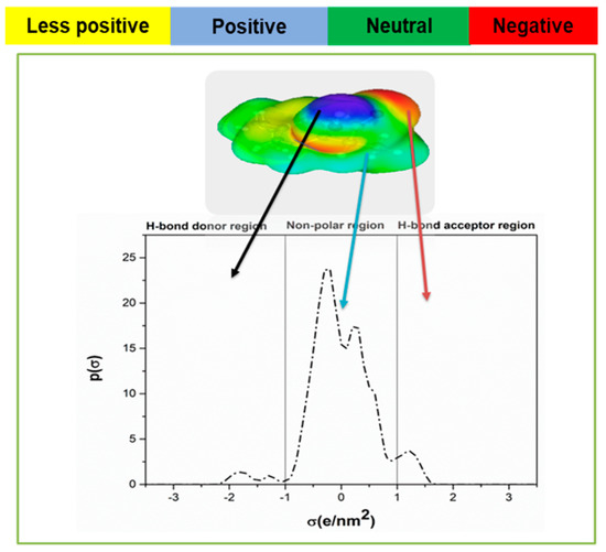 This section presents the results obtained using COSMO-RS for Ibf, the development of the ILGELM using the screened IL, and an experimental validation. Sigma surface along with σ-profile and σ-potential are shown in Figure 1 and Figure 2, respectively. The sigma surface represents the polarity, charge distribution, nature of bonding [39,44]. The colors green, blue, and red represent neutral, positive, and negative charges corresponding to the non-polar, H-bond donor, and H-bond acceptor regions on the σ-profiles [45]. Figure 1 shows sharp and light peaks both in polar and non-polar areas. Ibf shows a sharp peak at 0.3 e/nm2 in the non-polar area, revealing its capacity to be more attracted to non-polar molecules. The small peaks in the H-bond acceptor region are due to the presence of the (=O group), and those in H-bond donor regions are due to the OH− group [40]. The presence of peaks in the polar areas signifies an interaction with polar compounds [46]. A small peak is observed at −1.7 e/nm2 in the H-bond donor region, and a sharp peak at 1.2 e/nm2 in the H-bond acceptor region. As a result, the sigma potential revealed the interaction of Ibf with ILs. Figure 2 indicates that Ibf will function more as an H-bond acceptor (=O group); hence, it will interact and bond well with H-bond donor molecules. The polar nature of Ibf is due to the presence of the carboxylic acid group, and its non-polar nature is due to the presence of benzene and alkyl groups.