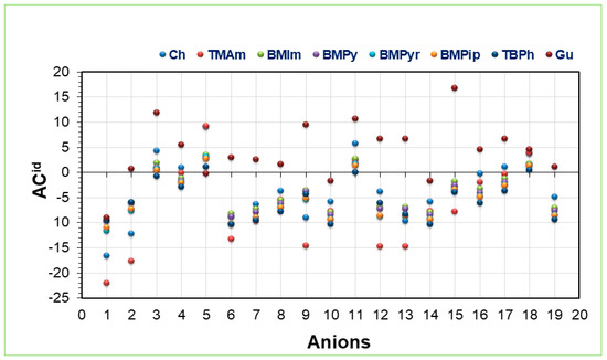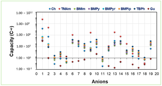 The capacity of the 152 IL combinations was evaluated at 25 °C, and the results are presented in Figure 4. The order of the capacities in relation to cations were [TMAm] > [Ch] > [BMPyr] > [BMPip] > [TBPh] > [BMPy] > [BMIm] > [Gu]. Table S4 presents the capacity values. It was observed that cations consisting of π bonds, i.e., aromatic rings such as pyridinium and imidazolium, showed lower capacity values at infinite dilution (C∞) than cations devoid of it. These results are in good agreement with the results reported in our previous study on LA [34]. Hence, it can be concluded that hydrogen bonding will favor the extraction of Ibf [51].