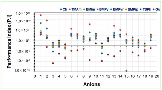 The ILs which possess higher selectivity also have higher values of capacity. Sometimes, ILs that possess high selectivity may not possess high capacities or vice versa. Hence, the performance index is used to find a suitable IL. The performance index is the product of capacity and selectivity. Figure 6 presents the values of [TMAm], [Ch], [BMPyr], [BMPip], [TBPh], [BMPy], [BMIm], [Gu], and 19 anions. The values were calculated using Equation (1). [TMAm], [Ch], and [BMPyr] possess higher values of PI due to their higher values of capacity and selectivity. Table S6 presents the calculated performance index values.