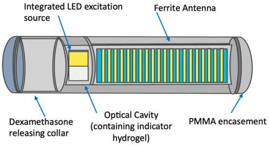 Scheme of the Senseonics Eversense implanted module probe containing one or two (depending on the model—for 90 or 180 days) silicon collars slowly releasing dexamethasone to diminish the inflammatory response in the implantation site. The indicator polymer is in proximity of the optical system that flashes the UV-LED to measure the fluorescence intensity of the indicator gel. The controller performs the measurements and connects to the externally worn transmitter wirelessly to collect and store data points. From [22] with permission from Wiley.