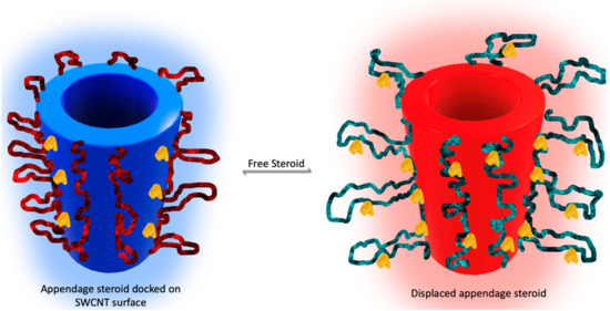 A biorecognition element formulated in the presence of the analyte—molecularly imprinted polymer (MIP)—is another example of nanochemistry used for the cortisol monitoring task. A self-imprinted polymer functionalized with the appendage steroid—acrylated cortisol—was created on the single-wall carbon nanotube (SWCNT) surface interpolymer pockets of the same size and surface charge as a free steroid. As the free steroid concentration increased, the acrylated appendage cortisol was easily displaced from the SWCNT surface, releasing the polymer loops farther from the SWCNT. Such flexible polymer loop movement changes the physico-chemical properties of the sensor to be detected as the analytical signal proportional to the free cortisol concentration (Figure 8) [59].