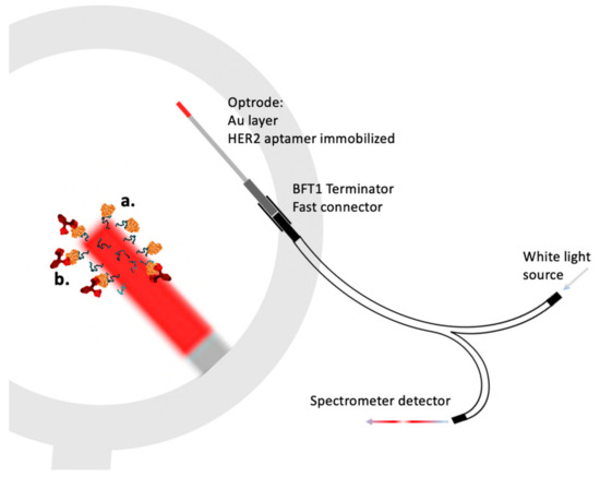 Another example of an optical fiber surface as a sensing probe and assay substrate is a multimode step-index silica core of 400 µm in diameter, silica in 25 µm TECS cladding, and a decladded 1-cm tip coated with 45 nm gold to obtain the surface-plasmon resonance (SPR) substrate. Such an optrode was further modified with aptamers catching HER2, a cancer biomarker that is the target for the bonding of the monoclonal antibody to HER2. The optrode is connected by the bundle-waveguide (Y-bundle, FC-PC, and BFT1 connectors of Thorlabs) to the white light source and the spectrometer reading the backscattered light (Figure 11) [71].