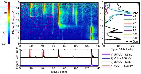 Data were collected in three runs, each over a different range of photon energies, which include: (1) hv = 8 → 12 eV in 10 meV steps, (2) hv = 11 → 15 eV in 20 meV steps, and (3) hv = 12 → 20 eV in 40 meV steps. Whilst data up to 20 eV photon energy was recorded, only data in the hv = 8.55–15 eV range is presented in this paper, as this is sufficient to assist in the analysis of the UV/UV experiments. The data presented in Figure 2 is stitched together from the three runs, explicitly using data from run (1) in the range hv = 8.55 → 11.5 eV, run (2) in the range hv = 11.5 → 14 eV, and run (3) in the range hv = 14 → 15 eV. Switch-over points were chosen to account for both signal strength and the effects of the gas filter of the beamline [70]. The smallest step size of 10 meV approximately matches the bandwidth of the monochromatic beam [67]. This collection method produced a fine scan over the region where ions of interest would start to appear, as well as providing sufficient overlap between each run, allowing for normalisation of signal between runs, and accounting for changes of gas filters in the beamline [70]. For each data point, 180 s worth of data was collected.