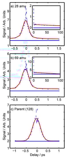 Figure 4 shows the time-dependent signals of the 28 amu (a), 69 amu (b), and parent ions (c). Plots for other ions can be found in the supplementary data in Figures S7–S9. For all ions, a “fast” signal drop within the first picosecond around the time-zero position was observed. After this, the parent ion signal simply decayed to the background level. Most fragment ions show slow decays that remained above the background level for hundreds of picoseconds. Subplots have been included in Figure 4a,b to show the longer-lived decays for the 28 and 69 amu ions, respectively.