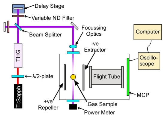 Figure 6 shows a simplified version of the experimental set-up used in the UV/UV studies, and is similar to the set-up used in previously published experiments [47]. In this, a 1 W, 1 kHz, 35 fs, 800 nm beam from a Ti:Sapphire laser is directed through a third harmonic generation (THG) set-up. The UV pulse energy is controlled by detuning the input beam polarisation with respect to the THG set-up via the rotation of a λ/2 plate situated before the THG set-up. After generation, the filtered third-harmonic light passes through a Michelson interferometer to produce collinear pump and probe beams, of which the delay between the two beams is controlled via a motorised translation stage. With the interferometer described so far, pump and probe beams of equal powers will be produced; this is the setup used in Section 2.1, Section 2.3, and Section 2.4. For results relating to those seen in Section 2.5, variable ND filters were inserted into the individual arms of the Michelson interferometer, allowing for the production of pump and probe beams with individually controlled pulse energies. After the interferometer, the beams are directed towards the vacuum apparatus via a number of reflectors and focussing optics. The spot size of the UV laser beams was measured to be approximately 30 μm in diameter. A power meter positioned directly at an exit viewport of the apparatus (after the laser is focussed in the chamber) was used to measure the power of the laser for each data point collected.