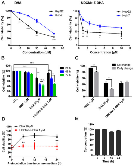 Figure 2. The growth inhibitory activity and stability of DHA and UDCMe-Z-DHA in HCC cells. (A) The effect of DHA and UDCMe-Z-DHA on the growth of HepG2 and Huh-7 HCC cells. Cells were treated for 72 h. HepG2 cells were significantly more sensitive to DHA and UDCMe-Z-DHA than Huh-7 cells. (B) Time-course study of DHA and UDCMe-Z-DHA in HepG2 cells. Cells were treated for 24–72 h. (C) The effect of daily change of DHA and UDCMe-Z-DHA on growth of HepG2 cells. Cells were treated for 72 h with no change or daily change of medium with fresh compounds. (D) Stability of DHA and UDCMe-Z-DHA in culture medium. Compounds were preincubated in medium for the indicated time periods at 37 °C before added to Hep2 cells for 72 h. The cell viability was measured by the MTT assay. (E) Chemical stability of UDCMe-Z-DHA in culture medium measured by HPLC-MS/MS. Data are presented as mean ± SEM of at least three independent experiments. Statistical significance was assessed by two-tailed Student’s t-test. * p < 0.05, ** p < 0.01, *** p < 0.001.