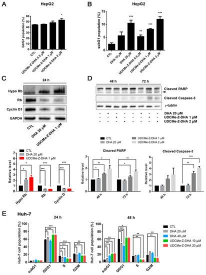 Figure 3. Effects of DHA and UDCMe-Z-DHA on cell cycle progression and apoptosis in HCC cells. (A) UDCMe-Z-DHA increased the G0/G1 population dose-dependently in HepG2 cells after 24 h treatment. Data are presented as mean ± SEM of 2–3 independent experiments. (B) DHA and UDCMe-Z-DHA significantly induced the subG1 population in HepG2 cells after 48 h treatment. (C) Rb and cyclin D1 protein levels in HepG2 cells treated with DHA and UDCMe-Z-DHA for 24 h. GAPDH was used as a loading control. (D) Apoptosis-related proteins in HepG2 cells treated with DHA and UDCMe-Z-DHA for 48 and 72 h. γ-Tubulin was used as a loading control. Representative images are shown in the upper panels and quantitative results are shown in the lower panels in (C,D). (E) Cell cycle distribution of Huh-7 cells treated with DHA and UDCMe-Z-DHA for 24 and 48 h. Data are presented as mean ± SEM of at least three independent experiments. Statistical significance versus the untreated vehicle control (CTL) was assessed by two-tailed Student’s t-test. * p < 0.05, ** p < 0.01, *** p < 0.001.