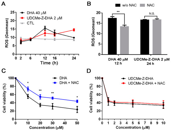 Figure 4. DHA and UDCMe-Z-DHA induce ROS in HepG2 cells. (A) Time course of ROS induction by DHA and UDCMe-Z-DHA. (B) NAC reversed ROS generation induced by DHA but not UDCMe-Z-DHA. (C) NAC reversed the growth inhibitory effect of DHA. (D) NAC did not affect the growth inhibitory effect of UDCMe-Z-DHA. In (C,D), HepG2 cells were treated with DHA or UDCMe-Z-DHA in the absence or presence of 2 mM NAC for 72 h, and cell viability was measured by the MTT assay. Data are presented as mean ± SEM of at least three independent experiments. Statistical significance was assessed by two-tailed Student’s t-test. * p < 0.05, ** p < 0.01.