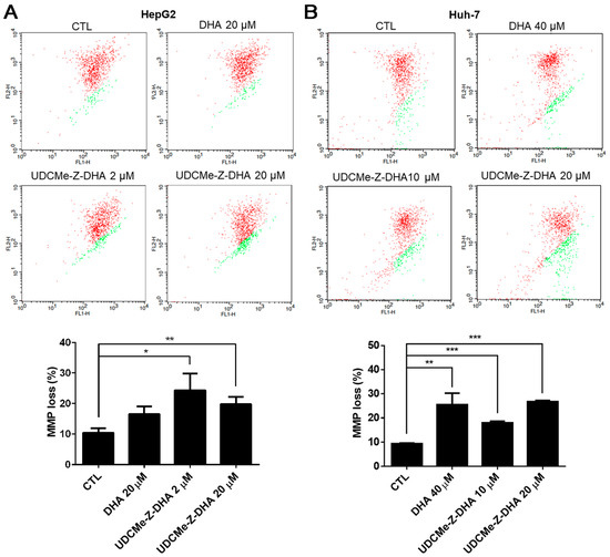 Figure 5. DHA and UDCMe-Z-DHA induced MMP loss in HCC cells. (A) HepG2 cells. (B) Huh-7 cells. HCC cells were exposed to indicated concentrations of DHA and UDCMe-Z-DHA for 48 h, and 5 μg/mL JC-1 was added to the cells 30 min before the termination of the incubation period at 37 °C. Cells were then harvested for flow cytometric analysis of JC-1 fluorescence. The percentages of cells with depolarization of MMP (labeled in green) were analyzed by CellQuest software. Data are presented as mean ± SEM of at least three independent experiments. Statistical significance was assessed by two-tailed Student’s t-test. * p < 0.05, ** p < 0.01, *** p < 0.001.