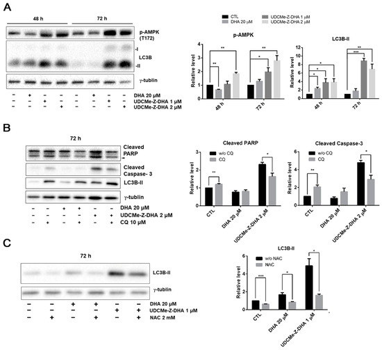 Figure 7. The effect of DHA and UDCMe-Z-DHA on autophagy and the interplay with ROS and apoptosis in HepG2 cells. (A) The effect of DHA and UDCMe-Z-DHA on the AMPK/autophagy signaling pathway in HepG2 cells. (B) Inhibition of UDCMe-Z-DHA-induced autophagy by chloroquine attenuated apoptosis. (C) Inhibition of ROS production by NAC attenuated autophagy induction by DHA and UDCMe-Z-DHA. Data are presented as mean ± SEM of at least three independent experiments. Statistical significance was assessed by two-tailed Student’s t-test. * p < 0.05, ** p < 0.01, *** p < 0.001.