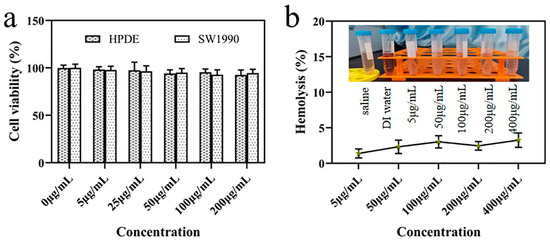 The cytotoxicity of graphene quantum dots (GQDs) and Gd(DTPA)−GQDs was evaluated on human normal pancreas (HPDE) cell lines and SW1990 cells using the CCK−8 assay. As depicted in Figure 4a and Figure S3, there was no noticeable cytotoxicity observed after 24 h of exposure to either of the nanoparticles at any of the tested concentrations. The hemolysis assay was also performed to ensure the feasibility of intravenous administration. Gd(DTPA)−GQDs of varying concentrations were incubated with red blood cells (RBCs), with saline and DI water serving as negative and positive controls, respectively. The hemolysis results, presented in Figure 4b and Figure S4, indicate that even at a high dose of 400 μg/mL, the hemolytic rate was below 5% and the RBCs remained intact, meeting the established standards for biomaterials hemolysis [46,47]. These findings demonstrate the excellent biocompatibility of Gd(DTPA)−GQDs.