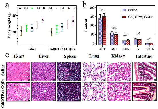 The in vivo safety was evaluated by monitoring bodyweight, conducting histological examinations, and measuring blood chemistry indices. At seven days post−treatment, the bodyweight of the Gd(DTPA)−GQDs−treated group showed no significant differences compared to the saline group (Figure 5a). Furthermore, Figure 5b indicates that the levels of liver and kidney function (liver function markers: aspartate transaminase (AST), alanine aminotransferase (ALT), and total bilirubin (T−BIL); kidney function markers: blood urea nitrogen (BUN) and creatinine (Cr)) did not significantly differ from the saline group (p > 0.05) after treatment with Gd(DTPA)−GQDs, suggesting no observable harm to the primary functions of the liver and kidney. Hematoxylin and eosin (H and E) staining images did not reveal any noticeable pathological changes in the heart, liver, spleen, lung, kidney, and intestine after treatment with either Gd(DTPA)−GQDs or saline (Figure 5c). These results demonstrate the high biocompatibility of Gd(DTPA)−GQDs, making them a suitable candidate for further in vivo bioimaging applications.