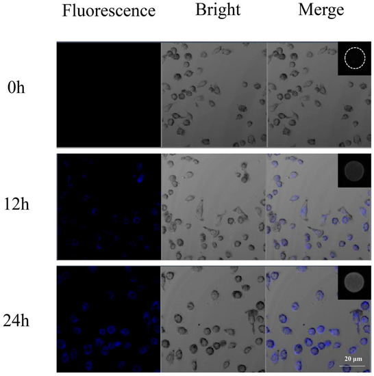 The cellular uptake efficiency of Gd(DTPA)−GQDs in SW1990 cells was evaluated utilizing fluorescence microscopy. As demonstrated in Figure 6, the Gd(DTPA)−GQDs fluorescence (represented by a blue color) accumulated within the cytoplasm of the SW1990 cells. With prolonged incubation, the blue signals within the cells increased, indicating that a greater number of Gd(DTPA)−GQDs were efficiently taken up by the cells over time (Figure S5a). To further assess the intracellular MRI enhancement effect, the nano−CA−treated SW1990 cells were collected, suspended in centrifugation tubes, and then examined using a Philips 3.0T MRI scanner (Figure 5, insert). As depicted in Figure S5b, the MR signal intensity increased with extended incubation time, demonstrating that more Gd(DTPA)−GQDs were successfully taken up by the cells over time.