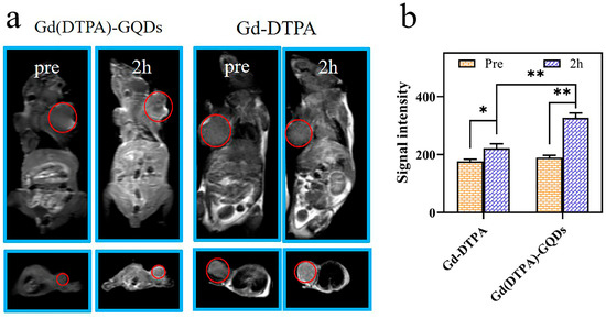 The magnetic resonance (MR) properties of Gd(DTPA)−GQDs were subjected to testing. Intravenous injections of Gd−DTPA and Gd(DTPA)−GQDs were administered to SW1990 mice with tumors, each at a dose of 1 mg (1 mg of Gd3+ per kg). As depicted in Figure 7a, the location of the tumor (red circle) was distinctly visible 2 h post−injection. An examination of the MRI signal intensity images obtained from the Gd−DTPA and the Gd(DTPA)−GQD groups revealed a marked enhancement in the latter, likely due to its elevated r1 value (Figure 7b). These results indicate that Gd(DTPA)−GQDs hold potential as a T1−positive nano−contrast agent.