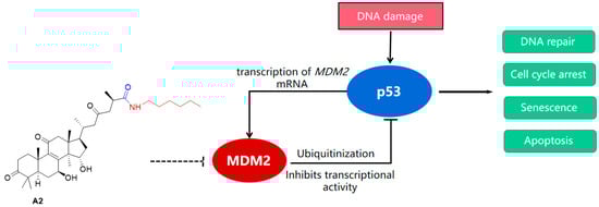 MCF-7 is a commonly used tumor cell line. Previous studies have shown that GAA has some anti-tumor activity against MCF-7, and there is a high expression of MDM2-p53 in MCF-7. The anti-tumor activities of GAA derivatives on MCF-7 were tested for 48 h, and the results were shown in Table 1 and Figure 3. The results showed that compounds A2, A6, A7, A8, A9, A15 had significant anti-proliferation activities on MCF-7 cell line compared with GAA. Among all derivatives, A6 has the strongest anti-proliferation effect, and its inhibition rate of MCF-7 at 50 µM can reach 63.64%.