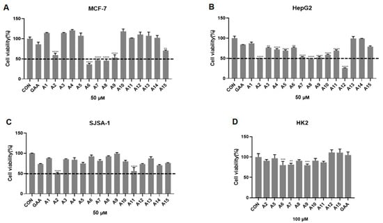 The anti-proliferation effect of GAA derivatives on different cell lines. (A) The viability of MCF-7 cells treated for 48 h with 50 µM concentration of synthesized compounds; (B) The viability of HepG2 cells treated for 48 h with 50 µM concentration of synthesized compounds; (C) The viability of SJSA-1 cells treated for 72 h with 50 µM concentration of synthesized compounds; (D) The viability of HK2 cells treated for 48 h with 100 µM concentration of tested compounds. All data are presented as mean ± SD of three independent experiments. CON refers to cells treated with 0.1% DMSO; ** p < 0.01, *** p < 0.01, **** p < 0.0001 vs GAA by ANOVA.