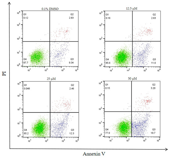 Flow cytometry analysis of SJSA-1 cells after 24 h incubation with A2 at concentration of 12.5 µM, 25 µM, 50 µM and subsequent staining with Annexin V and propidium iodide. Q3 and the percentage means the proportion of the early phase apoptosis cells and Q2 and the percentage means the proportion of the late phase apoptosis cells.