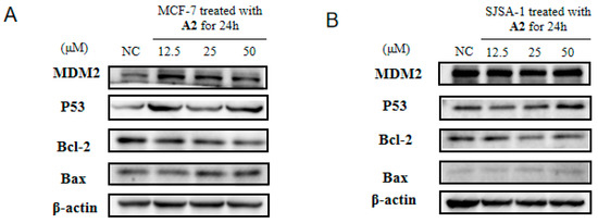 The effect of A2 on the relative protein expression. The protein expression in MCF-7 (A) and SJSA-1 (B) treated with A2 for 24 h with a concentration of 12.5, 25 and 50 µM. NC refers to 0.1% DMSO.