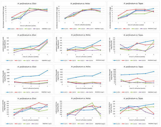 Agitated cultures of H. perforatum cultivars were chosen as an experimental model in our previous research [15,16]. Now, we decided to study the dynamics of biomass growth and the accumulation of three groups of metabolites in agitated cultures maintained in four variants of the MS medium with different BAP and NAA content for five weeks, aiming at the selection of the most optimal variant and growth cycle for further research.
