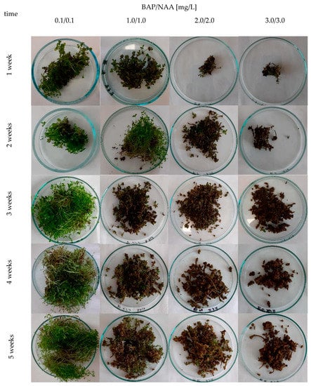 Morphology of microshoots from agitated H. perforatum cv. Elixir in vitro cultures depending on the concentration of PGRs tested (BAP and NAA) [mg/L] in a MS medium variant during 5-week growth cycles.