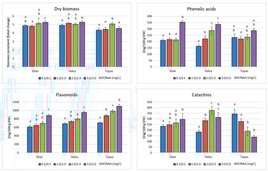 Dry biomass increments, and phenolic acid, flavonoid, and catechin contents in biomass extracts from in vitro cultures of H. perforatum cultivars (Elixir, Helos, Topas) after 4-week growth cycles in PlantForm bioreactors in MS medium with different amounts of PGRs. The metabolite content is expressed as the sum of the individual compounds determined by HPLC analysis. a–d Different letters indicate significant differences (p < 0.05).