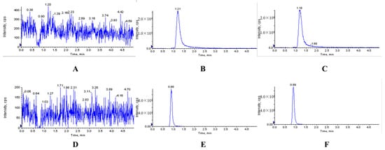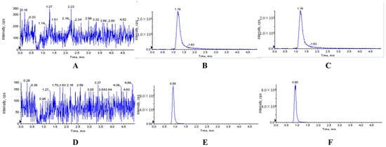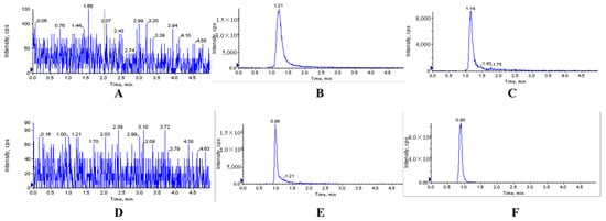 Representative MRM chromatograms of XYY-CP1106 and IS in rat feces. (A) Blank fecal sample; (B) blank fecal sample spiked with XYY-CP1106; (C) actual fecal sample collected after oral administration of XYY-CP1106; (D) blank fecal sample; (E) blank fecal sample spiked with IS; (F) actual fecal sample collected after oral administration of IS.