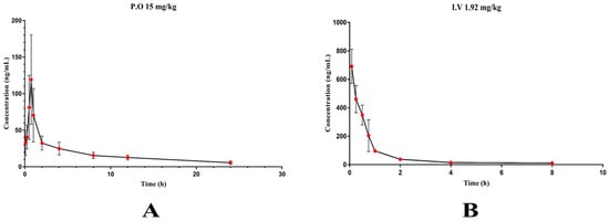 Plasma concentration–time curve of XYY-CP1106. (A) 15 mg/kg by intragastric administration; (B) 1.92 mg/kg by tail vein injection.