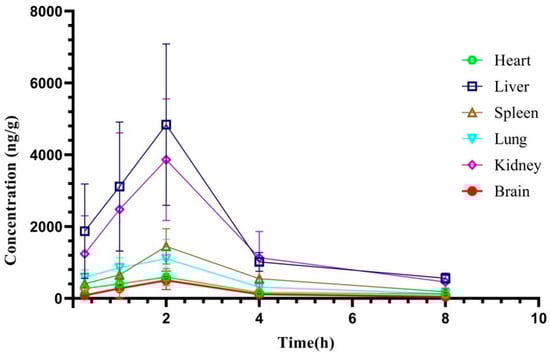 According to the results of pharmacokinetic study, the times at 0.25, 1, 2, 4 and 8 h were selected for tissue distribution study. The tissue distribution results of XYY-CP1106 in rats after oral administration (15 mg/kg) are shown in Figure 6. The results revealed that XYY-CP1106 was rapidly and widely distributed into all six tissues. As shown in Figure 5, XYY-CP1106 was mainly distributed in the liver and kidneys due to the higher concentration in the liver and kidneys than that in other tissues. Meanwhile, it was found that the main metabolic organ of XYY-CP1106 was the liver by comparing the concentration changes of XYY-CP1106 at 2 h and 4 h. After 2 h of oral administration, the concentrations of XYY-CP1106 in the brain of rats were (500.52 ± 260.12) ng/g, indicating that XYY-CP1106 could penetrate the blood–brain barrier (BBB).