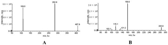 The ion scanning mass spectrograms of the products of XYY-CP1106 and IS were shown in Figure 8. Non-compartmental calculations were performed using the PK Solver plug-in (China Pharmaceutical University, Nanjing, China) to estimate the main pharmacokinetic parameters []. All values were expressed as the mean ± standard deviation.