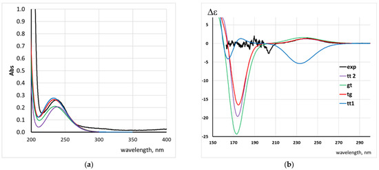 As a result of quantum chemical simulation, the structures of the most energetically stable conformers were calculated; their energies and internal rotation angles are listed in Table 1. The electronic circular dichroism (ECD) spectra of flexible chiral molecules depend on their stereochemistry in terms of both the absolute configuration and the molecular conformation, which very sensitively determines the overall shape of the spectrum, including the sign. The uniquely high sensitivity of ECD to conformation makes this technique a useful alternative or addition to standard conformational spectroscopic instruments such as NMR [30]. In this regard, on the basis of quantum-chemically optimized structures, the ECD and UV/Vis spectra of the four most stable conformers were calculated (Table 1) (see experimental section) and presented in Figure 1 together with the experimental CPDA spectra.