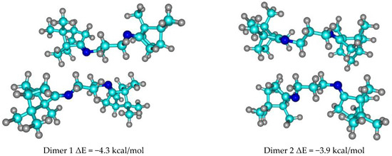 The transfer of chirality during associative processes creates opportunities for the phenomenon of chiral memory and chiral separation [33]. Taking this into account, quantum-chemical simulation of the supramolecular dimerization of bis-camphorolidenpropylenediamine (CPDA) in its most stable tg-conformation was carried out (Figure 2). As a result, two most stable structures were obtained (dimer 1 and dimer 2, Figure 3), the calculated characteristics of which are given in Table 1, the ECD spectra in Supplementary Materials Figure S5).