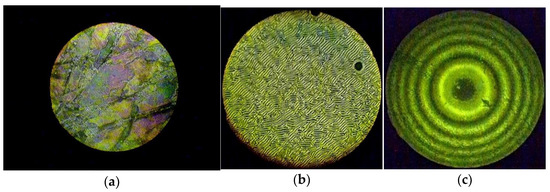 The behavior of conformationally flexible chiral dopants during helix induction in nematic liquid crystals is of particular interest. In this work, the mesomorphic and physical properties of a liquid crystal based on a binary eutectic mixture of alkoxycyanobiphenyls (CB-2) doped with camphorodiimine CPDA were studied (see the experimental section). The introduction of this dopant in an amount of several percent into a nematic LC leads to twisting the helix, as evidenced by the fingerprint texture typical of a chiral nematic in polarized light [34] and the interference pattern with Newton’s rings (Figure 4).