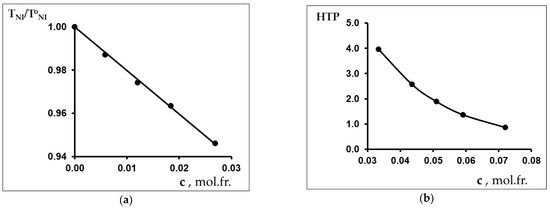 Polarization microscopy was used to measure the clearance temperatures of a chiral nematic (phase transition N*→I) with different contents of a chiral dopant, presented as a fragment of the phase diagram (TNI/T°NI = f(c), where T°NI is the clearance temperature of the initial LC, c is the molar fraction of dopant (Figure 5a). These results were confirmed by DSC data (Figure S6).