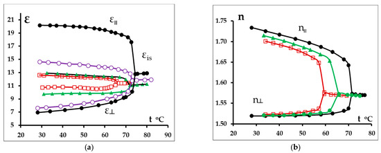 The temperature dependences of the dielectric constant components (ε║, ε┴, εis ) and refractive indices (n║, n┴, nis) of CPDA solutions in the nematic LC (Figure 6) indicate a strong influence of the chiral dopant on the physical properties of both the chiral nematic and its isotropic phase. Doping with even small additions of CPDA has the strongest effect on the dielectric constant of the LC (Figure 5a), sharply lowering the anisotropy ∆ε = ε║ − ε┴ due to 3D compensation of the polar LC dipoles in the helical structure [26]. Modification with a chiral dopant also reduces the birefringence ∆n = n║ − n┴ mainly due to a decrease in the parallel component n║ owing to a decrease in the orientational order parameter.