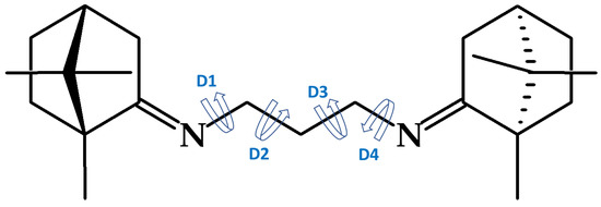 To search for the most stable conformations of biscamphorolidenpropylenediamine (CPDA), we scanned the energy profile during rotation of dihedral angles D1, D2, D3, D4. For the found “stable conformations” additional geometry optimization was carried out using density functional theory, CAM-RB3LYP functional basis set of 631G(d,p) included geometry optimizations followed by computations of harmonic vibrations. Force-field calculations yielded no imaginary frequencies, indicating that the optimized configurations correspond to the minima on the potential energy hypersurfaces.