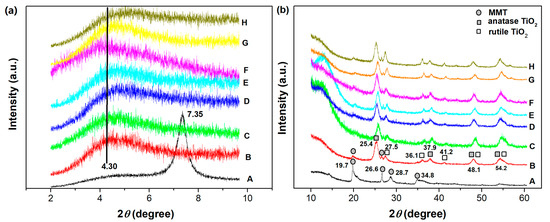 XRD patterns of the TiO2-MMT/PCN@Pd nanocomposites with 2θ small angle from 2 to 10° (a) and wide angle from 10 to 60° (b): A. MMT; B. TiO2-MMT; C. TiO2-MMT80/PCN20; D. TiO2-MMT80/PCN20@Pd2+; E. TiO2-MMT80/PCN20@Pd0; F. TiO2-MMT60/PCN40; G. TiO2-MMT60/PCN40@Pd2+; H. TiO2-MMT60/PCN40@Pd0.