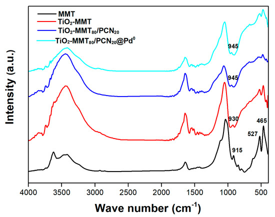 FTIR spectra of the MMT, TiO2-MMT, TiO2-MMT80/PCN20 support, and TiO2-MMT80/PCN20@Pd0 nanocomposites.