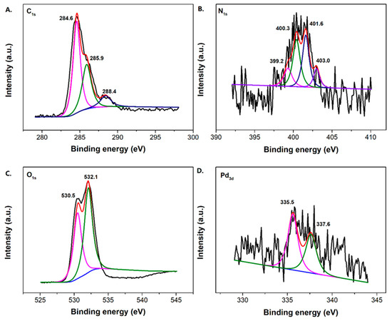 XPS spectrum of the C1s (A), N1s (B), O1s (C), and Pd3d (D) of the TiO2-MMT60/PCN40@Pd0 nanocomposites.