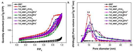 N2 adsorption/desorption isotherms (A) and corresponding pore size distribution (B) of the TiO2-MMT/PCN@Pd nanocomposites.