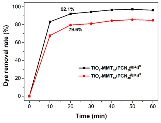 The N2 adsorption–desorption isotherms and corresponding pore size distribution of the starting Na-MMT, TiO2-MMT, and TiO2-MMT/PCN@Pd nanocomposites are shown in Figure 5. Based on the isotherms, the extracted BET surface area (SBET), micropore area (Amic), and total pore volume (Vtot) are listed in Table 1. All of the samples show distinct hysteresis loops at a higher P/P0 of 0.4 and considerable adsorption amounts at a low relative pressure, suggesting type IV isotherms with fairly good adsorption capacity. For Na-MMT, the hysteresis loops are assigned to the typical H3 type, implying poor mesopores. For the TiO2-MMT and TiO2-MMT/PCN@Pd nanocomposites, all of the hysteresis loops are assigned to the typical H4 type, implying rich, narrow, and slit-like mesopores. The pore size distribution peaks of TiO2-MMT are located at about 4 nm (minor peak) and 10 nm (major peak). This suggests that TiO2 modification leads to the effective formation of numerous mesoporous layered structures. After hybridizing with PCN and the Pd2+ species, the pore size distribution peaks of TiO2-MMT/PCN show little shift, indicating that the introduction of these species has limited effects on the mesopore size of the TiO2-MMT matrix. However, both in the case of TiO2-MMT80/PCN20@Pd0 and TiO2-MMT60/PCN40@Pd0, the pore distribution peaks become obviously broader in the range of 10–16 nm. The increase in the larger-sized mesopores is ascribed to the generation of numerous disordered mesopores due to the reduction in the Pd2+ species to Pd0 nanoparticles. The SBET of TiO2-MMT (161.1 m2/g) is about 13.8 times that of the starting Na-MMT (11.6 m2/g). The Vtot of TiO2-MMT (0.37 cm3/g) is about 9.2 times that of the starting Na-MMT (0.04 cm3/g). This is closely related to the induction of a large number of new stable porous structures after TiO2 pillaring, which is in good agreement with the XRD results. However, after the loading of the PCN and the Pd species, it is observed that the SBET and Vtot show a reasonably decrease. For the TiO2-MMT80/PCN20@Pd0 series, SBET decreases to 137.3 m2·g−1 (TiO2-MMT80/PCN20), 114.9 m2·g−1 (TiO2-MMT80/PCN20@Pd2+), and 108.9 m2·g−1 (TiO2-MMT80/PCN20@Pd0), respectively; Vtot shows a little decrease to 0.37 cm3/g (TiO2-MMT80/PCN20), 0.36 cm3/g (TiO2-MMT80/PCN20@Pd2+), and 0.27 cm3/g (TiO2-MMT80/PCN20@Pd0), respectively. For the TiO2-MMT60/PCN40@Pd0 series, SBET decreases to 124.2 m2·g−1 (TiO2-MMT60/PCN40), 121.1 m2·g−1 (TiO2-MMT60/PCN40@Pd2+), and 89.6 m2·g−1 (TiO2-MMT60/PCN40@Pd0), respectively. Vtot shows a little decrease to 0.33 cm3/g (TiO2-MMT60/PCN40), 0.30 cm3/g (TiO2-MMT60/PCN40@Pd2+), and 0.27 cm3/g (TiO2-MMT60/PCN40@Pd0), respectively. Nevertheless, the adsorption capacity and porosity of such novel TiO2-MMT/PCN@Pd0 is superior to the recently prepared adsorbents or heterogeneous catalysts using TiO2-pillared MMT or MMT/PCN composites as a matrix [35,36,37,38,39,40]. As confirmed in the adsorption tests for the rhodamine B dye at room temperature (as shown Figure 6), both TiO2-MMT80/PCN20@Pd0 and TiO2-MMT60/PCN40-Pd0 show fairly good adsorption removal efficiency for the dye molecules (only 20 min reaching the equilibrium adsorption removal). Obviously, the former (92.1%) is better than the latter (79.6%). This might be due to the higher surface area of TiO2-MMT80/PCN20@Pd0 than TiO2-MMT60/PCN40-Pd0. The highly porous structure and high surface area performance should be in favor of excellent catalytic performance of the resultant nanocomposites.
