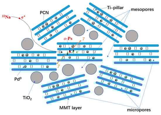 According to the microstructure characterization results above, the textile structure of the nanocomposite can be illustrated in Scheme 1. The mesoporous structure (using the N2 adsorption–desorption isotherms and adsorption-removal test), interlayer spacing (using XRD), morphologies (using HRTEM), and compositions (using HRTEM-EDX, Raman spectroscopy, FTIR) are successfully revealed. However, the sub-nano level microstructure, such as the molecular packing information of the derived TiO2 pillars, PCN, and active Pd species inside the TiO2-modified MMT layer space still lacks essential evidence. Positron annihilation lifetime spectroscopy (PALS) has recently been proven as one of the most highly sensitive methods to detect microstructure information at the sub-nano level [61,62,63,64,65]. In the interlayer space with low electron density, in addition to free positron annihilation, some of the thermalized positrons can be trapped with electrons to form a bound state called positronium (Ps), and then annihilate. Ps has two states, o-Ps (spin parallel) and p-Ps (spin antiparallel), depending on the spin orientations of the positrons and bound electrons. In a vacuum, the intrinsic lifetimes of p-Ps and o-Ps are 0.125 ns and 142 ns, respectively. In molecular solids, o-Ps will form interactions with the electrons in the surrounding medium and undergo pick-up annihilation, resulting in a reduction in the lifetime of 1 to several ns. Using a suitable quantum mechanical model [66,67], the o-Ps lifetime is correlated to the microdefect size. It can then be used as a sensitive probe to detect the local microdefect structure.