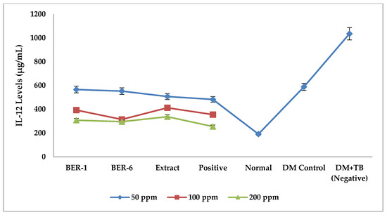 The results of Tukey’s post hoc test (Table 3) between the negative control group (DM+TB) with isolates and extracts were significantly different (* p < 0.05), indicating that there are immunomodulating potential of isolates and extracts, while the positive control with isolates and extracts showed significant differences in terms of the effect of reducing IL-12 levels (* p < 0.05).