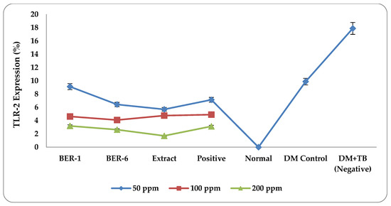The research revealed that the expression of TLR-2 after the administration of isolates and extracts to DM model macrophage cells infected with TB antigens decreased compared to those of the DM and DM+TB groups. This study is in line with several previous studies that explained that a decrease in TLR-2 expression is needed to control excessive inflammatory responses in DM conditions or during TB infection and prevent more severe complications with TB infection [21,23]. A sufficient expression of TLR-2 protects the host during TB infection by regulating the pro-inflammatory and anti-inflammatory cytokines [31]. It plays a role in increasing the activity of phagocytic cells, which eliminate the TB infection, and modulate type 2 DM to prevent TB infection [32,33].