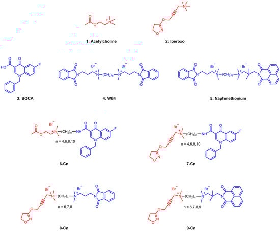 Structures of muscarinic orthosteric ligands (1,2), allosteric modulators (3,4,5), and dual-steric hybrid compounds ACh/BQCA (6-Cn), Iperoxo/BQCA (7-Cn), Iperoxo/W84 (8-Cn), and Iperoxo/Naphmethonium (9-Cn) investigated by using muscarinic FRET receptor sensors.