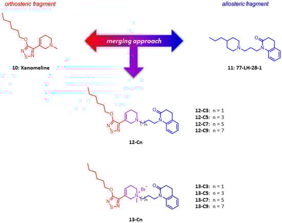 Design of the target Xanomeline/77-LH-28-1 hybrid compounds 12-Cn (12-C3, 12-C5, 12-C7, and 12-C9) and 13-Cn (13-C3, 13-C5, 13-C7, and 13-C9) derived from merging the orthosteric ligand Xanomeline (10) with the allosteric modulator 77-LH-28-1 (11).